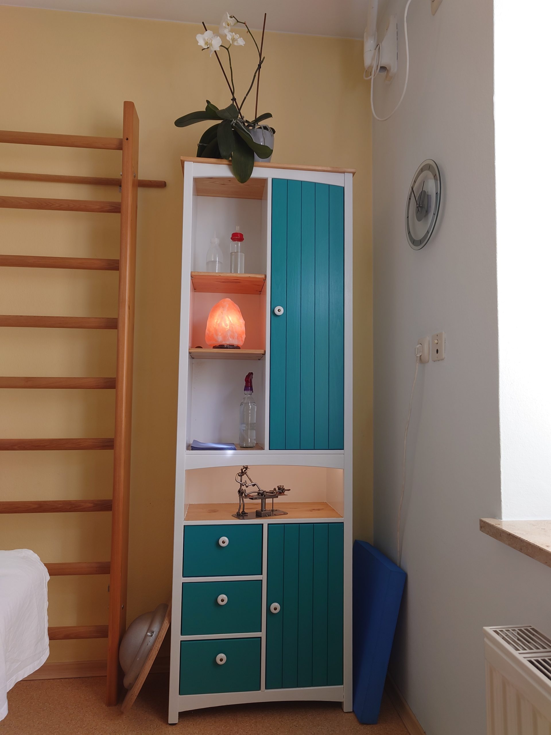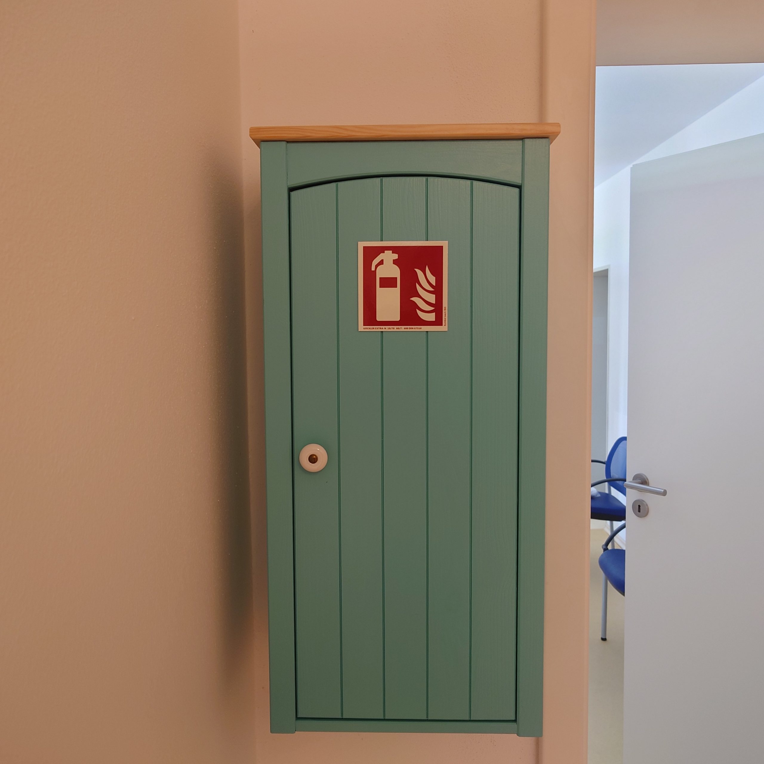 Sicherheit ist wichtig! Trotzdem darf das Hängekästchen für unseren Feuerlöscher in den Stil der Praxiseinrichtung passen. Mit dem Möbelstück das aufgrund eines Umzugs ein neues Zuhause gesucht hat ist uns der Spagat gelungen. Weitere Möbelstücke aus dem selben Umzug findest du in unserem großen Artikel über Nachhaltigkeit im PhysioVib!